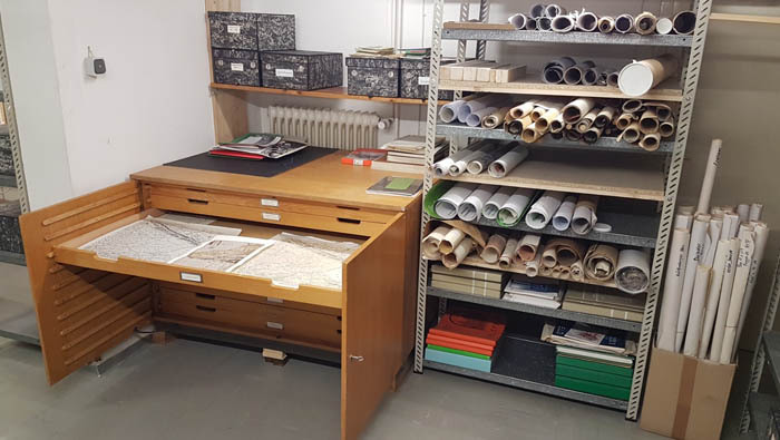 Der zentrale Aufbewahrungsort von Plänen und Karten in einem Schubladenschrank und einem Rollenregal, zusammen mit einem 1 m x 2 m großen Betrachtungstisch bilden eine funktionale Einheit.